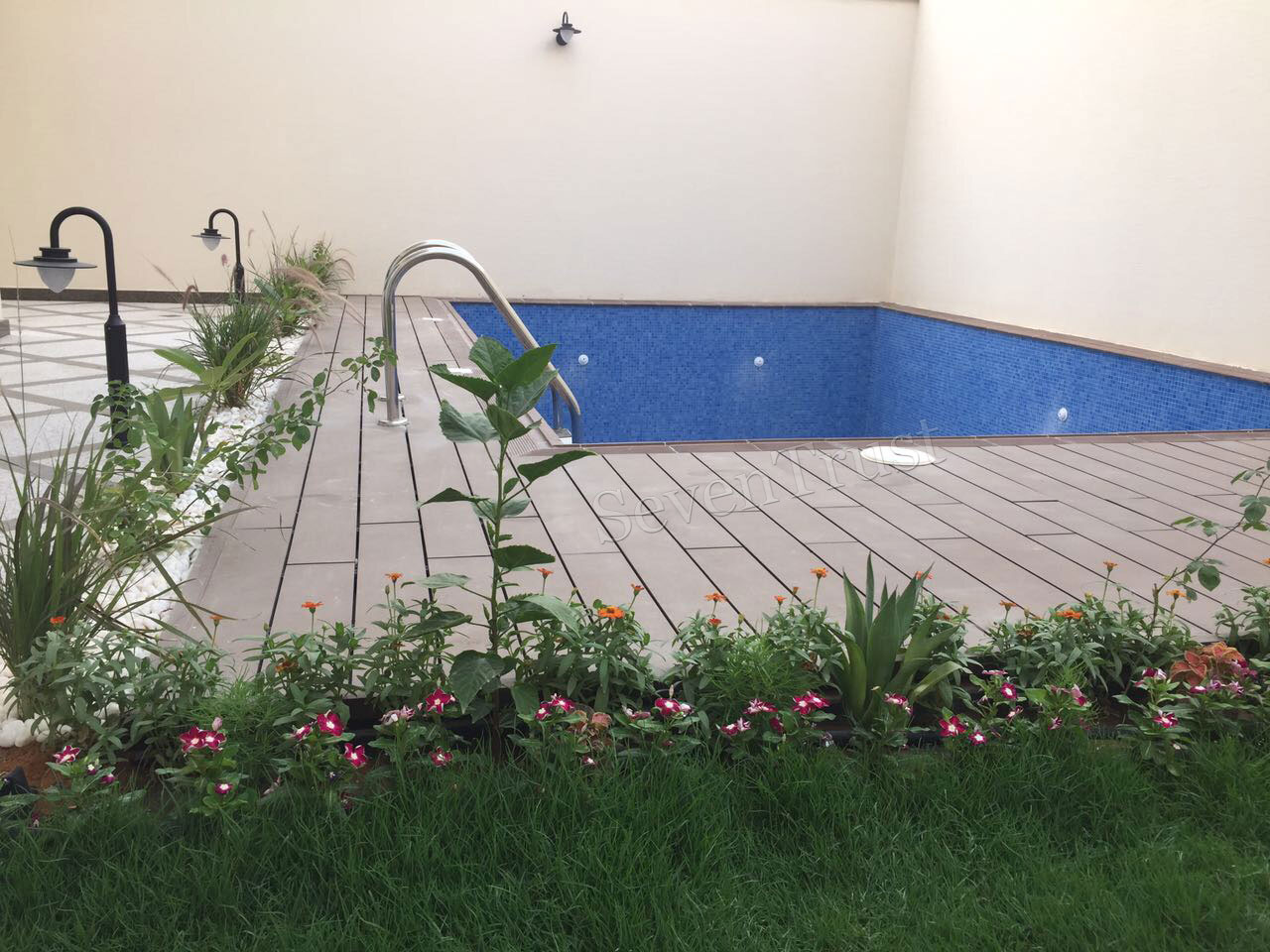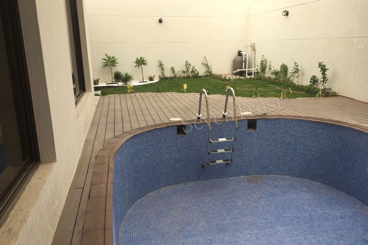 這是他在利雅得新建室外游泳池平臺的項目。 他通過將木塑地板切成適合該區域的不同尺寸來進行鋪裝。